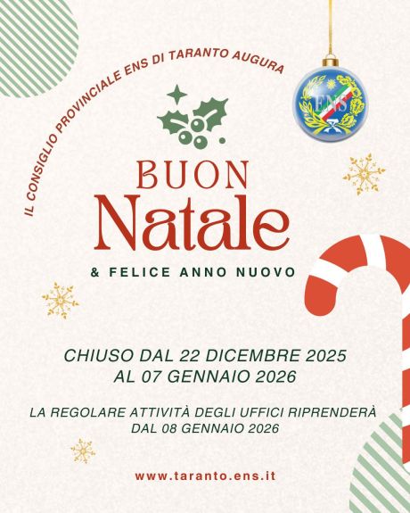 Il Consiglio Provinciale ENS di Taranto, nell’augurare a tutti Voi e ai Vostri cari serene festività natalizie e felice Anno Nuovo, ricorda che la sede resterà chiusa dal 22 dicembre 2025 al 07 gennaio 2026.