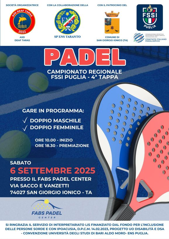 L'ASD Deaf Taras organizzerà sabato 6 Settembre 2025, con la collaborazione della Sez. Prov.le ENS di Taranto e con il Patrocinio del Comune di San Giorgio Ionico (TA), il Campionato Regionale FSSI Puglia di Padel che si terrà presso il Centro Sportivo "Fabs Padel Center" di San Giorgio Ionico (TA)